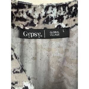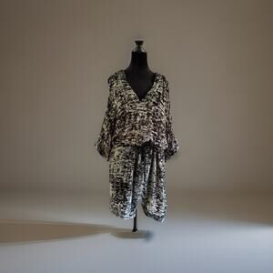 Gypsy 05 velvet burnout dress in black and white abstract print. Size large. Features cold shoulder sleeves, V-neckline, drawstring waist, and a soft asymmetrical hem. The velvet burnout texture catches light with every step—equal parts boho and glam. Lightweight stretch fabric with a luxe feel. Excellent pre-owned condition with no flaws.