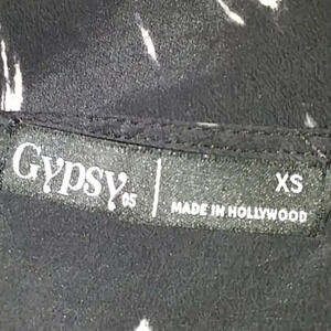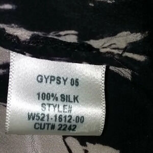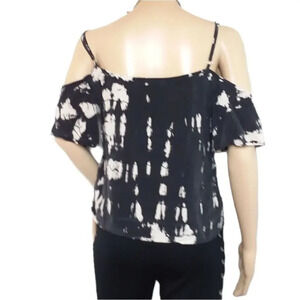 100% silk cold shoulder cropped top by Gypsy 05 in a black and bleached shibori reverse dye pattern. Adjustable straps