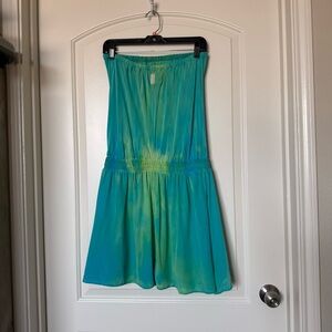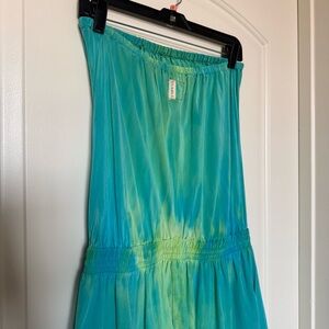 Chic strapless dress in turquoise/green watercolor (tie dye mermaid colors). Features a comfortable fit.