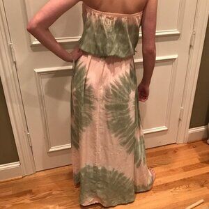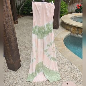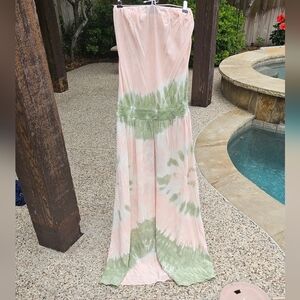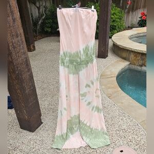 The Silk is nicely thin and cooling, tie-dyed in a soft baby pink and muted moss green. T
