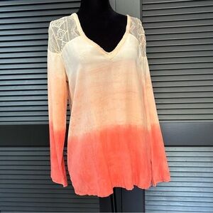 Gypsy 100% Silk Boho Coral Ombré V Neck Embroidered Long Sleeve Boho Top,Size XS