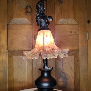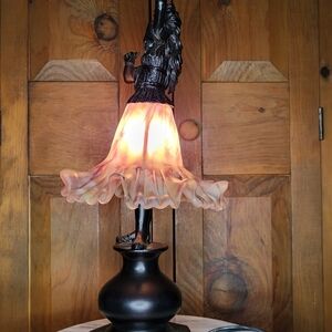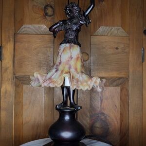 Illuminate your space with this elegant dancer / Gypsy table lamp. Featuring a striking black base and a flowing skirt, this lamp adds a touch of sophistication to any room. No chips or cracks and is in Super Excellent Original Condition. Rare Find. $150.
