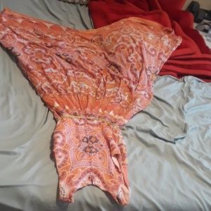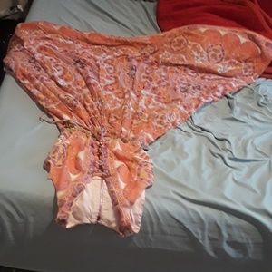 Long dress with adjustable bust and hooks at the top of the zipper. The top is not see through, the skirt is somewhat. Thin and flowy material, has some wear but I feel like a goddess everytime I'm in it.