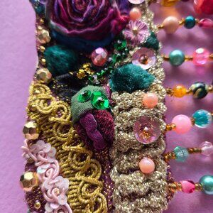 Drape your wrist in pure enchantment with this whimsical cuff that channels vintage glamour. Ornate hand-embroidered rose and rosebuds dance across in stunning jewel tones, with meticulous ornate stitching incorporating an eclectic treasure trove of vintage and collected materials. The edges drip in a kaleidoscope of colors and textures with beaded fringing made of vintage glass, wood, acrylic and plastic beading creating a visual feast for the eyes. The Velcro closure makes for adjustable wearing. This is a smaller size, but just message me for custom sizing.