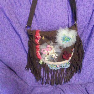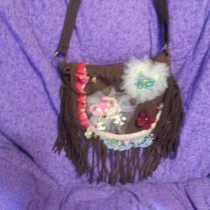 Gypsy, Hippie, Boho, upcycled embroidered, beaded, lace, tasseled, tule, flowers and zippers, brown background pocketbook. One of a kind, unusual. There is a beautiful bead with flowers painted on it, a heart and a cupid. These objects I sell are from many locations, thrift stores, garage sales, church sales, estate sales and antique shops etc. so if allergic to smoke, pet dander, or dust please buy from someone else. There is probably nothing wrong, but I cannot guarantee one hundred percent, these are items that are usually secondhand. Thank You.