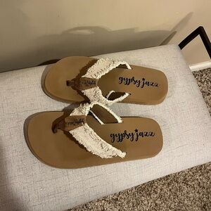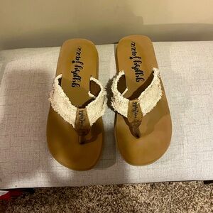 Step into comfort with these stylish Gypsy Jazz flip flops. Featuring a chic tan color, these sandals are perfect for any casual outing. Enjoy the blend of fashion and comfort with every step.