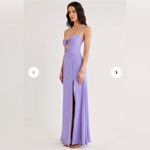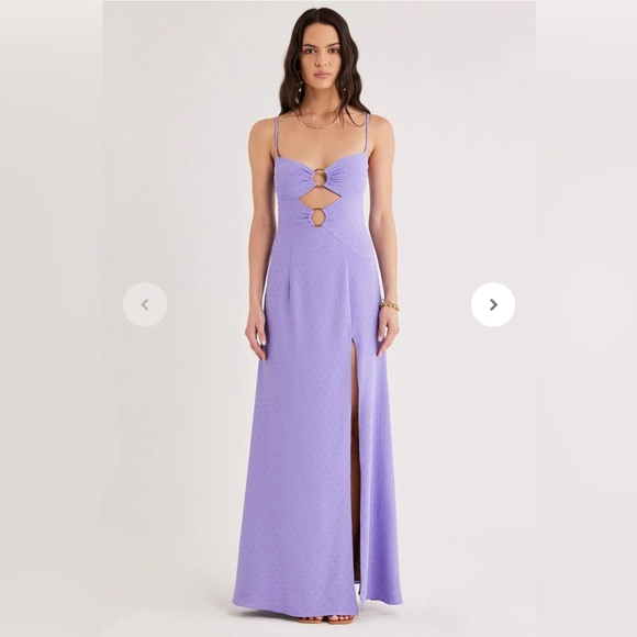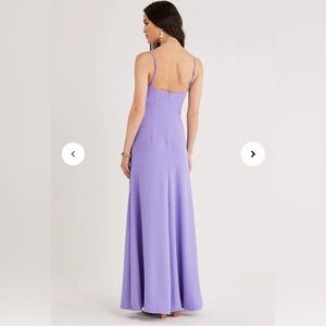 Floor length maxi with thin adjustable straps & zip closure at back.