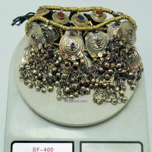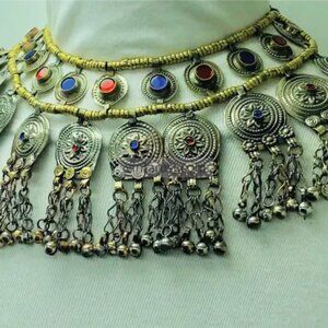 Afghan choker combines rustic elegance with bold, bohemian vibes. The harmonious blend of golden, silver, red, and blue tones creates a captivating contrast that stands out beautifully against any attire. Its traditional Kuchi-inspired design makes it ideal for festive occasions or cultural events, adding a unique flair to your ensemble.