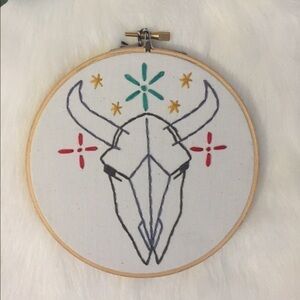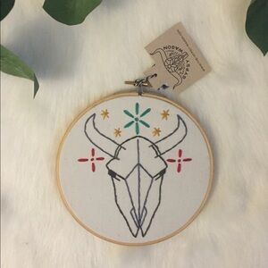 Handmade Gypsy Wagon Western Chic Cow Skull Embroidered Hoop. Made in the USA.