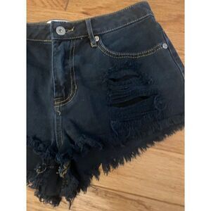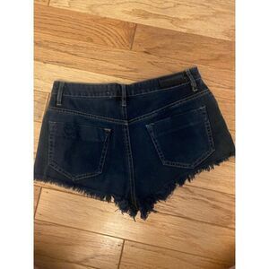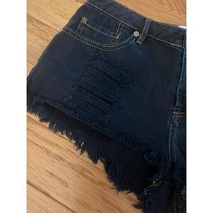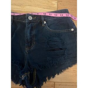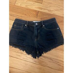 Gypsy Warrior, juniors dark distressed low rise shorties with frayed hem size 5