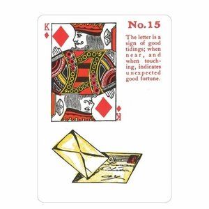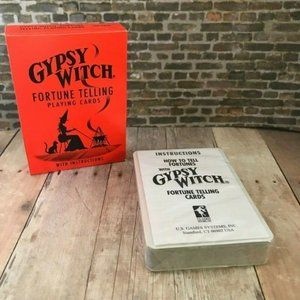 Gypsy Witch Fortune Telling Playing Cards deck provides an easy-to-learn method of divination. Each Gypsy Witch card is numbered and displays a pictorial illustration of the card’s symbolic meaning. Individual meanings of the cards are also written on the card faces. Standard cards are shown in miniature in the upper left corner.