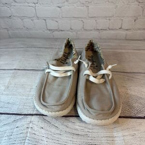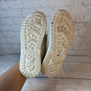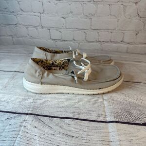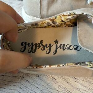 Stylish cream slip-ons with floral interior. Perfect for casual wear.