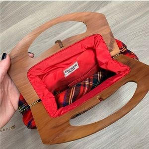 EUC vintage red plaid handbag, wooden handle with toggle closure, accessories include matching gloves (sz small), small scarf, and small red card pouch. Lined with small inside open pocket. No holes or stains. Made in England.
