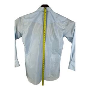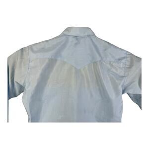 The H Bar C Pearl Snap Rodeo Cowboy Eagle El Dorado Ranchwear Western Shirt in size 15.5 is a vintage-inspired button-up shirt perfect for casual occasions, travel, or parties. Made of a breathable polyester blend with a striped pattern, this shirt features a collared neckline, point collar style, and long sleeves. The shirt also includes convenient pockets and is machine washable for easy care. With Western themes and accents like a cowboy character and logo details, this shirt is a stylish and classic addition to any wardrobe.