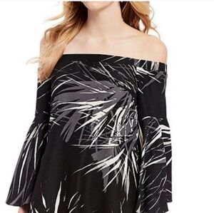 H by Halston off the shoulder dress. Black and white graphic print. Bell sleeves. Swing style.
