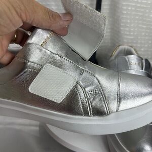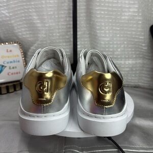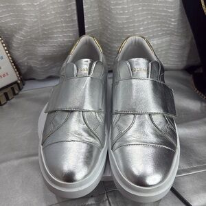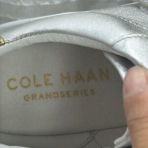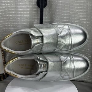 (H) Cole Haan GrandPro Rally Velcro Sneaker size: Women's 9B, in very good used condition. See photo for details. Elevate your style with Cole Haan's silver and gold platform sneakers, featuring a metallic leather upper and a chunky white rubber sole for added height. The sleek design is enhanced by gold accents near the heel and paneled detailing on the sides, making these sneakers a perfect blend of fashion-forward and athletic styling.