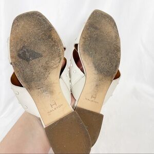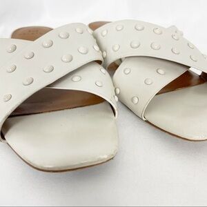 Open square toe, slide on style, leather, backless. Studded details. Cream, neutral, ivory. Casual, spring, summer.