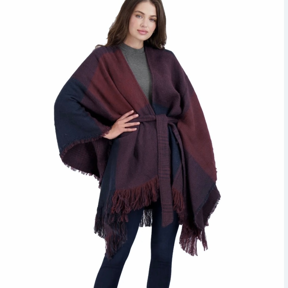 H Halston beautiful burgundy and navy blue ruana cardigan with belt that comes through holes in sides and creates the look of a sleeve (although there are not actually sleeves) - new with tags - one size fits most - 49” total width when layed out flat - approx 23” distance from front belt hole to front belt hole - belt length approx 70” - length when layed out flat including fringe is approx 33” - new with tags