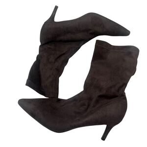 H Halston Women's Brown Girona Stiletto Heeled Dress Booties Size 8.5 NWOT. The Girona is a stiletto heel boot that has stretch to provide a perfect fit. This is the perfect dressy bootie that pairs well with any outfit. Heel height - 2". Shaft height - 11". Shoe width - Medium. Slip on. Manmade upper, vegan leather lining, manmade sole. Non-skid sole. Manmade. Spot Clean. Imported.