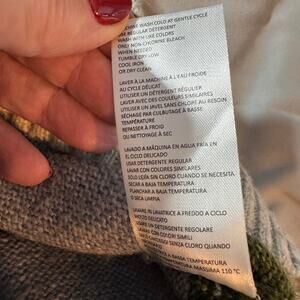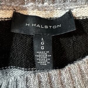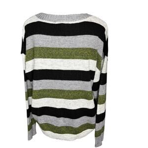 H Halston Women's sz Large Green Gray Black White Stripe Pullover Sweater LS