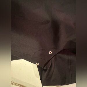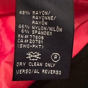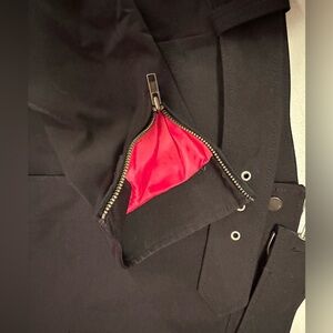 H Hilfiger vintage ladies size small black Moto jacket. This beautiful wonderful quality jacket has snap closure on top at neckline and bottom of zipper with belted closure neck and waist, sleeve eyelet vents on front and back, pink lined, and zippers at wrist. There is a very small faint area on neck strap, see last photo, and a slight separation in lining at seam still intact. Measurements are in photos, dry clean only, made of a sturdy rayon nylon and spandex blend.