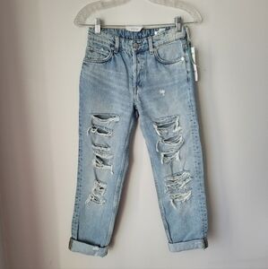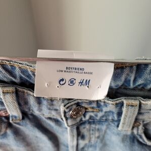 H & M Boyfriend Distressed Jeans. Women's size 0. New with tags. 5-pocket, looser-fit jeans in washed cotton denim with heavily distressed details. Low waist, zip fly with button, and dropped gusset. Tapered legs. Cotton content is partly recycled.