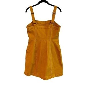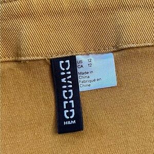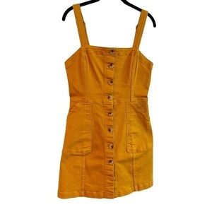 H & M, GOLD DENIM MINI DRESS. BUTTON DOWN FRONT, 2 POCKETS. SIZE 12