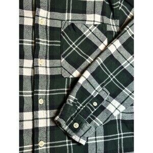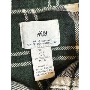 The product is a men's H&M green and white plaid long sleeve button-up shirt in size L. Made of flannel fabric, this shirt features a classic regular fit with a button closure and pockets. The shirt is perfect for casual occasions, adding a touch of style to any outfit with its traditional plaid pattern and classic design elements.