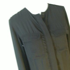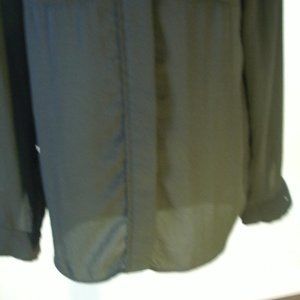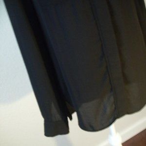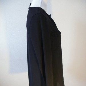 H&M Semi Sheer long sleeve collarless oversized black oversized button down shirt. Buttons are hidden by fabric . Two front flap pockets over bust,