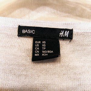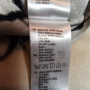 Here we have an H & M oversized light sweater it has drop shoulders and is high low and long sleeved. It is a size XS and an off white color with black stripes, very light woven sweater material. Measurements are shoulder to shoulder 20 inches bust 21 inches sleeves 17 1/2 inches and the length is 22 highest 25 lowest. Material is 50% Acrylic and 50% Viscose, machine wash warm line dry or dry clean. Has a faint stain I believe two of them shown in the next to last picture.