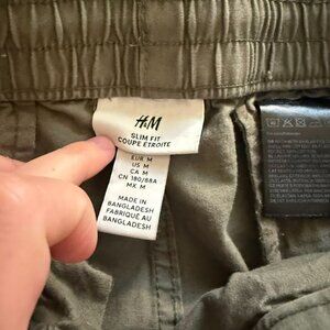 The product is a pair of H&M women's medium slim fit cargo pants in a stylish green color. Made from a cotton blend material, these pants feature a sleek silhouette with a slim fit and six pockets for convenience and functionality. Perfect for everyday wear, these pants offer a trendy and practical addition to any woman's wardrobe.