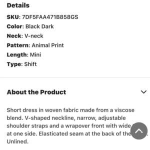 Soft and flowing V-neck with adjustable shoulder straps. Generous ties at waist and inside thin tie. Animal print with viscous blend material. Excellent condition.