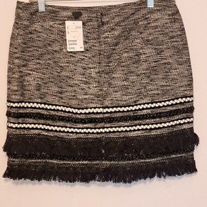 H & M Textured Black Fringe Skirt Size 14 NWT. Lined skirt. Back zipper with button. Fringe 100% Cotton, Skirt shell 65% Polyester/35% Cotton. Lining 100% Polyester. Measurements: Waist - 32" - 34", Hip - 39" - 40", Skirt Length - 17".