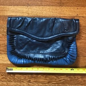 Super cute faux leather vintage-looking envelop clutch from H & M. 🦋🦋🦋 Navy blue with lighter blue detailing at edges. Hardly used, no flaws, just slightly out of shape from being packed away for years. About 13" wide. Inside zipper and pockets. No strap or handle.