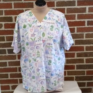 H. Q. Scrub top hits of hip measures 27 in. And from shoulder to him measures 28 in no stains or rips gently love.