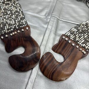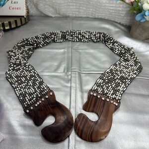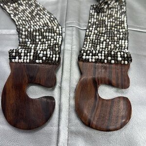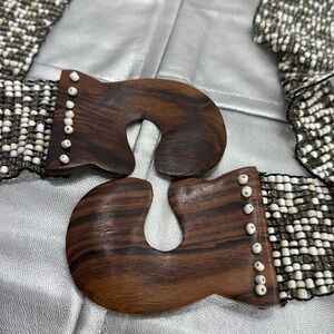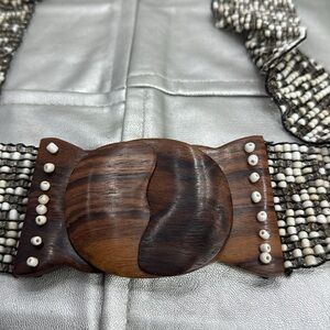 (H) Vintage Beaded Elastic Belt with Wooden Buckle for Women, Retro Hippie Bohemian Style, Plus Size, Perfectly Used Condition. See photo for more details. Stylish beaded belt with a unique wooden buckle. Perfect for adding flair to any outfit.