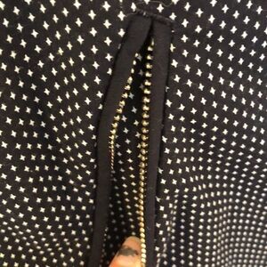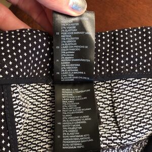 H and M black and white shorts with a cute design all over them. They have no size tag. They have two cute zip pockets in the front.