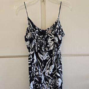 Black and White floral jumpsuit with spaghetti straps and a ruffle across the bust.