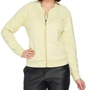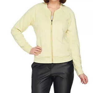 H by Halston Lightweight Stretch Textured Knit Zip Front Bomber Jacket. Color is a yellow shade, some may see a shade of green.