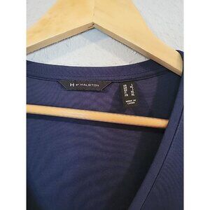 The H by Halston Regular Ruched Waist Elbow-Sleeve Midi Dress in Navy, size L, is a stylish and versatile option for casual occasions. Made from a comfortable blend of polyester and modal, this A-line dress features a round neckline, half sleeves, and a ruched waist for a flattering fit. The midi length and solid navy color make it a classic and easy-to-wear piece that can be dressed up or down with the right accessories. Perfect for women looking for a semi-fitted dress with unique details like elbow-length sleeves and side slits.