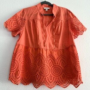 H by Halston Short Sleeve Mix Media Eyelet Cotton Blouse Top Size M
