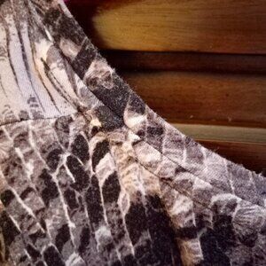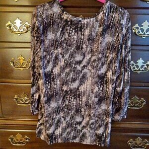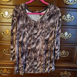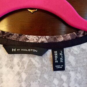 H by Halston Top, Printed Black, Blush & Gray V-Neck Ruching at Shoulder Size L