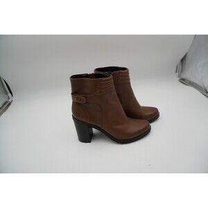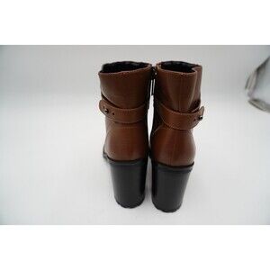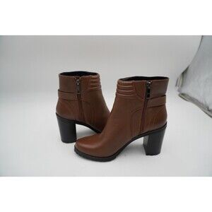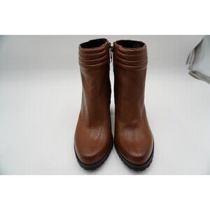 Brand New without tags or box H by Halston Cara brown leather boot. These brown ankle boots feature a smooth leather finish and a sturdy block heel for added stability. The side zipper ensures easy wear. While the rounded toe and decorative strap detail add a touch of elegance.
