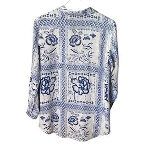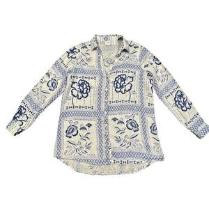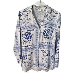 H by Halston Women’s Small Linen Blue White Floral Blouse
