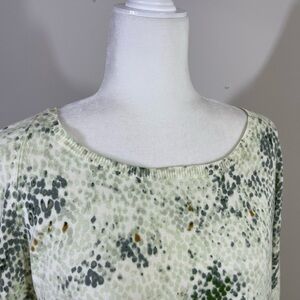 Very soft lightweight scoop neck sweater in a rayon and cotton blend. 3/4 sleeve length. Shades of moss, grass, and sage.in a sort of splatter design. The style is more of a looser fit. Measurements are armpit to armpit flatfold about 21”. The length from the top of shoulders to hem about 26”. Very nice with no visible flaws. Any questions please ask. Will answer questions as soon as possible. M