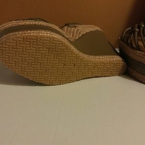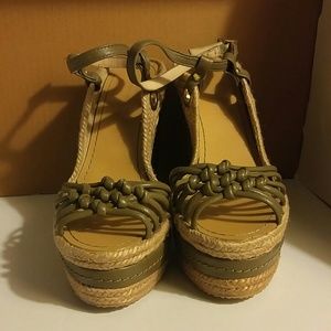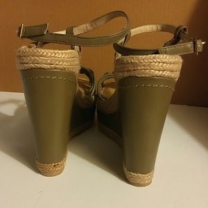 Olive green leather and braided raffia. 5.5" wedge with gold hardware. Lightly worn, EUC. Sorry no box. Open to offers.
