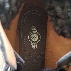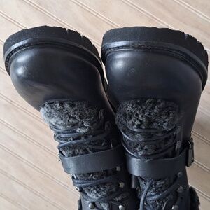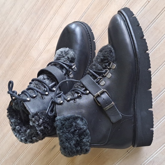•Style: Lace-up hiking-inspired ankle boots with adjustable buckle strap, chunky sole, high top lined with shearling.