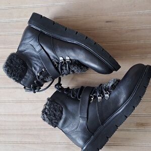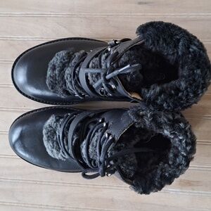 H by Hudson Adda Black Leather Shearling Lined Lace-Up Ankle Boots Trim Cozy