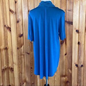 H by Halston Knit with Chiffon Drape blue tone Blouse. Excellent used condition. V-neck, short sleeve. Chiffon front with knit back and sleeves. High low hem. Size large. Measures chest 42”, length 27.5” front, 31.5” back. Sleeve 10.5”.