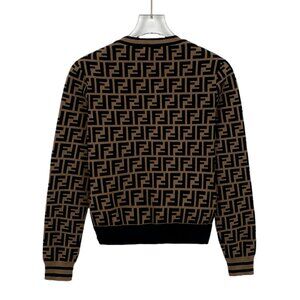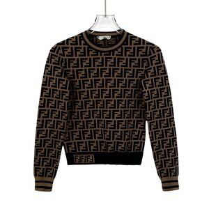 H12296 Fendi Brown Logo Letters Full Print Round Neck Long Sleeve Sweater 36 XS Size
